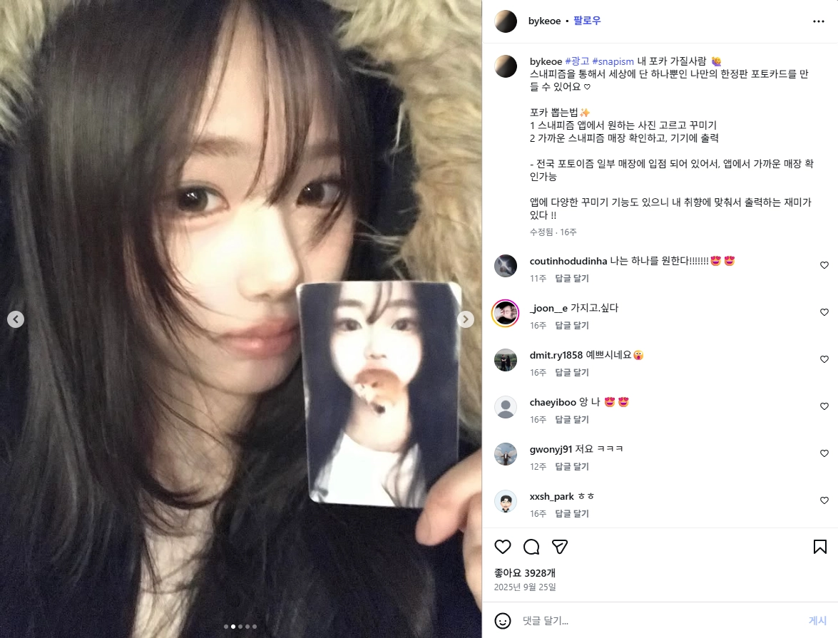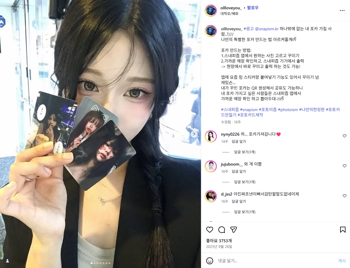 스내피즘 앱에서 내가 원하는 사진으로 포토카드, 스티커를 생성하고 가까운 스내피즘 매장을 방문해서 출력할 수 있습니다.