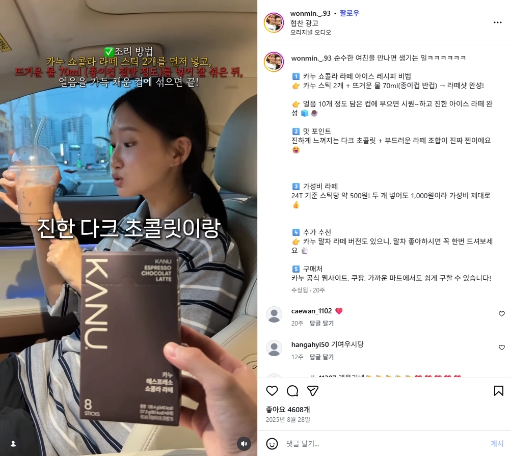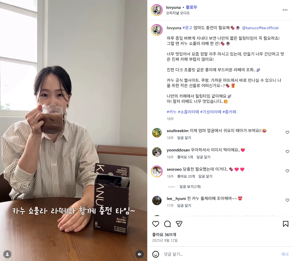 브랜드 ‘카누’의 이미지를 효과적으로 소구하기에 적합한 인플루언서를 선정하는 것에 집중했고, 그 덕분에 높은 퀄리티의 콘텐츠를 제작할 수 있었습니다.