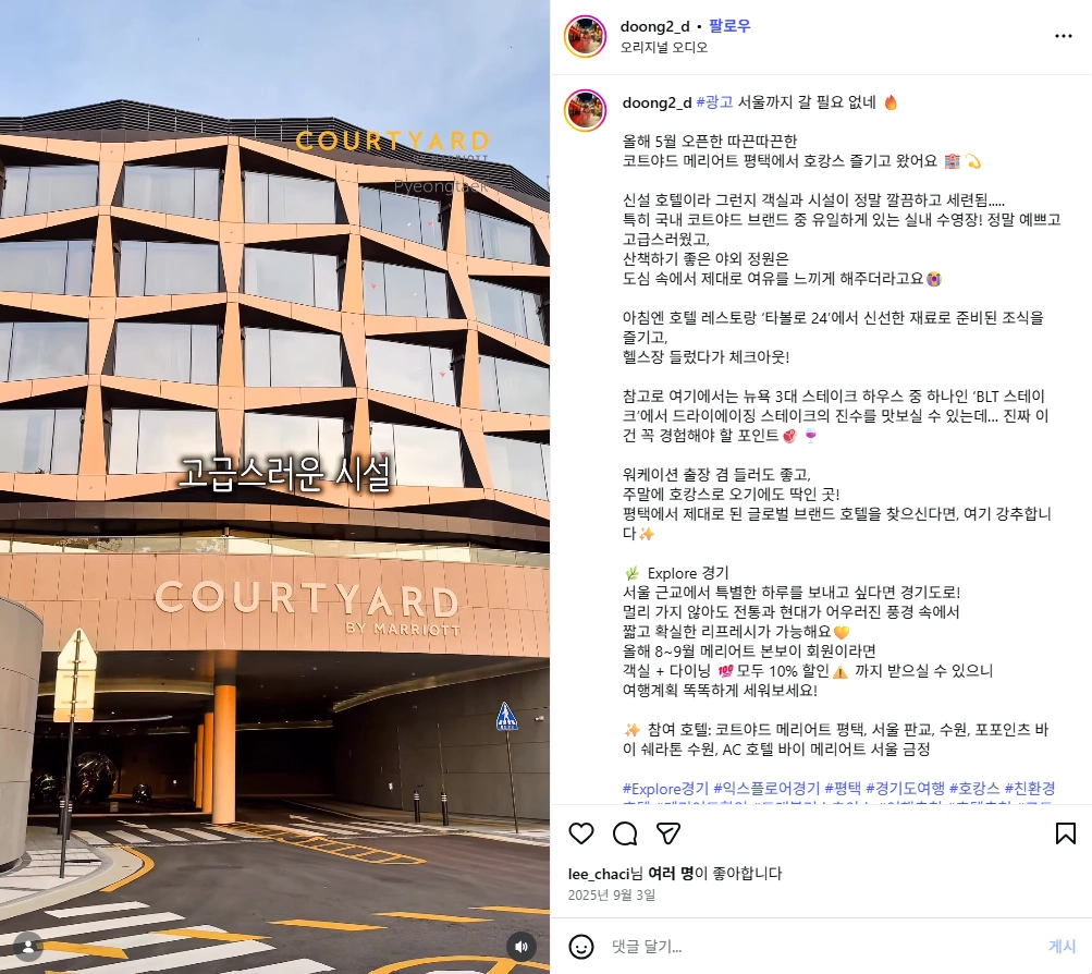 여행, Jua 🩷 국내 • 해외정보 on Instagram: "#광고 서울까지 갈 필요 없네 🔥 올해 5월 오픈한 따끈따끈한 코트야드 메리어트 평택에서 호캉스 즐기고 왔어요 🏨💫 신설 호텔이라 그런지 객실과 시설이 정말 깔끔하고 세련됨..... 특히 국내 코트야드 브랜드 중 유일하게 있는 실내 수영장! 정말 예쁘고 고급스러웠고, 산책하기 좋은 야외 정원은 도심 속에서 제대로 여유를 느끼게 해주더라고요😭 아침엔 호텔 레스토랑 ‘타볼로 24’에서 신선한 재료로 준비된 조식을 즐기고, 헬스장 들렀다가 체크아웃! 참고로 여기에서는 뉴욕 3대 스테이크 하우스 중 하나인 ‘BLT 스테이크’에서 드라이에이징 스테이크의 진수를 맛보실 수 있는데… 진짜 이건 꼭 경험해야 할 포인트🥩🍷 워케이션 출장 겸 들러도 좋고, 주말에 호캉스로 오기에도 딱인 곳! 평택에서 제대로 된 글로벌 브랜드 호텔을 찾으신다면, 여기 강추합니다✨ 🌿 Explore 경기 서울 근교에서 특별한 하루를 보내고 싶다면 경기도로! 멀리 가지 않아도 전통과 현대가 어우러진 풍경 속에서 짧고 확실한 리프레시가 가능해요💛 올해 8~9월 메리어트 본보이 회원이라면 객실 + 다이닝 💯모두 10% 할인⚠️ 까지 받으실 수 있으니 여행계획 똑똑하게 세워보세요! ✨ 참여 호텔: 코트야드 메리어트 평택, 서울 판교, 수원, 포포인츠 바이 쉐라톤 수원, AC 호텔 바이 메리어트 서울 금정 #Explore경기 #익스플로어경기 #평택 #경기도여행 #호캉스 #친환경호텔 #메리어트할인 #트래블러스초이스 #여행추천 #호텔추천 #코트야드메리어트평택 #평택호텔 #호캉스그램 #BLT스테이크평택 #코트야드메리어트 #메리어트"
