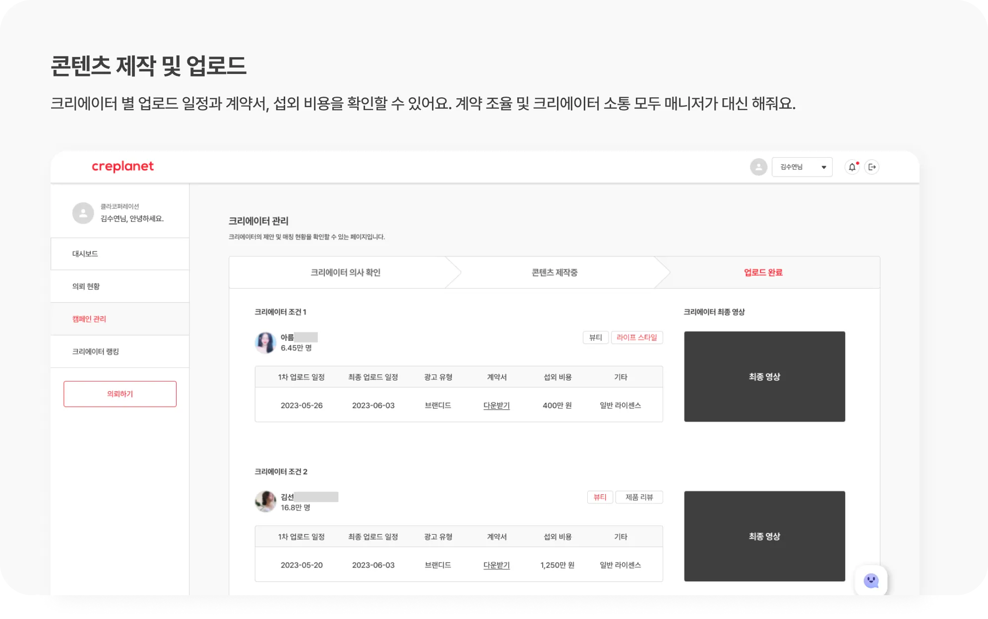 크리에이터와 협의 완료시 콘텐츠 제작에 들어갑니다.