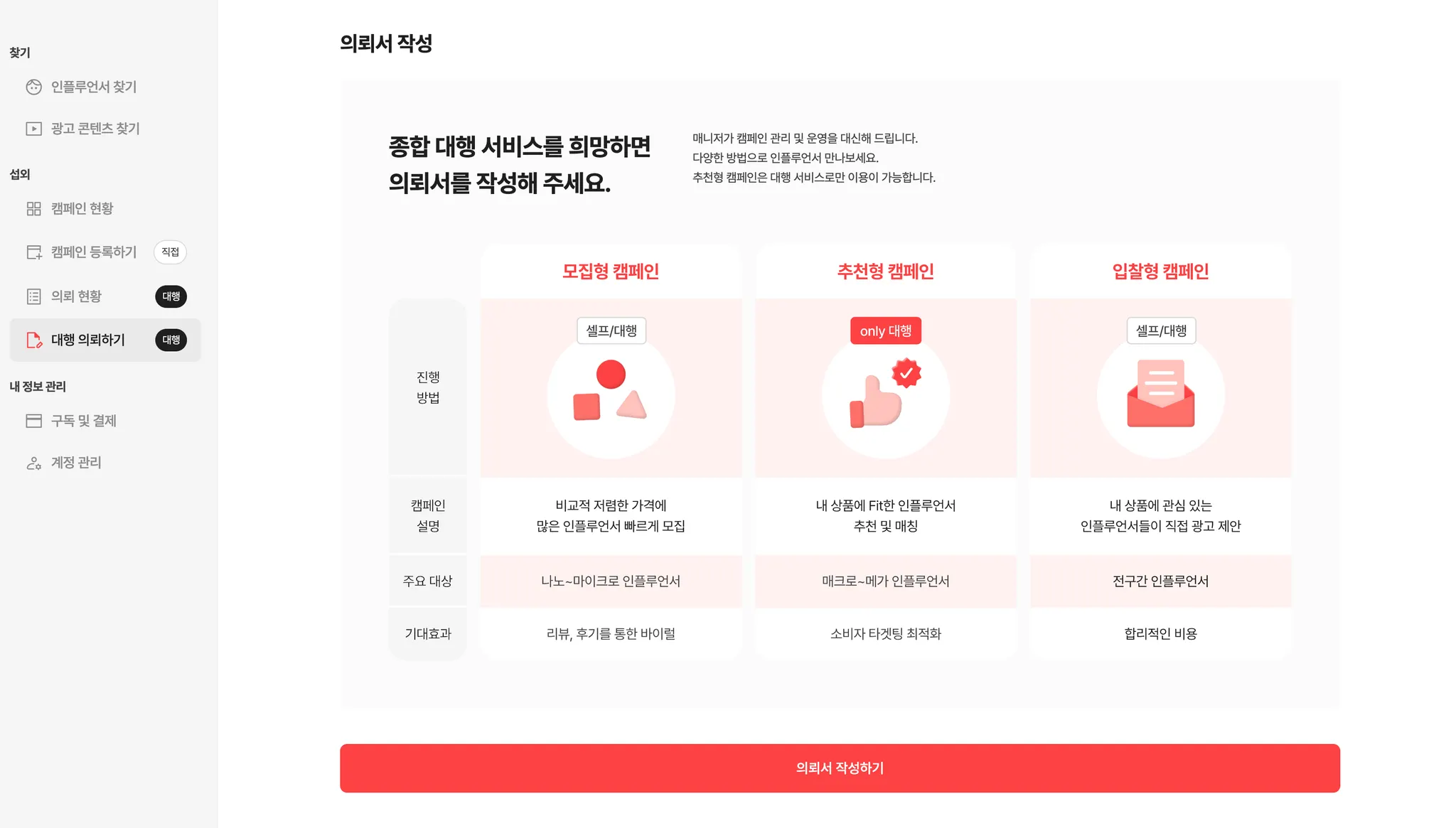 대행 의뢰하기로는 모집형, 추천형, 입찰형 캠페인을 의뢰할 수 있어요.