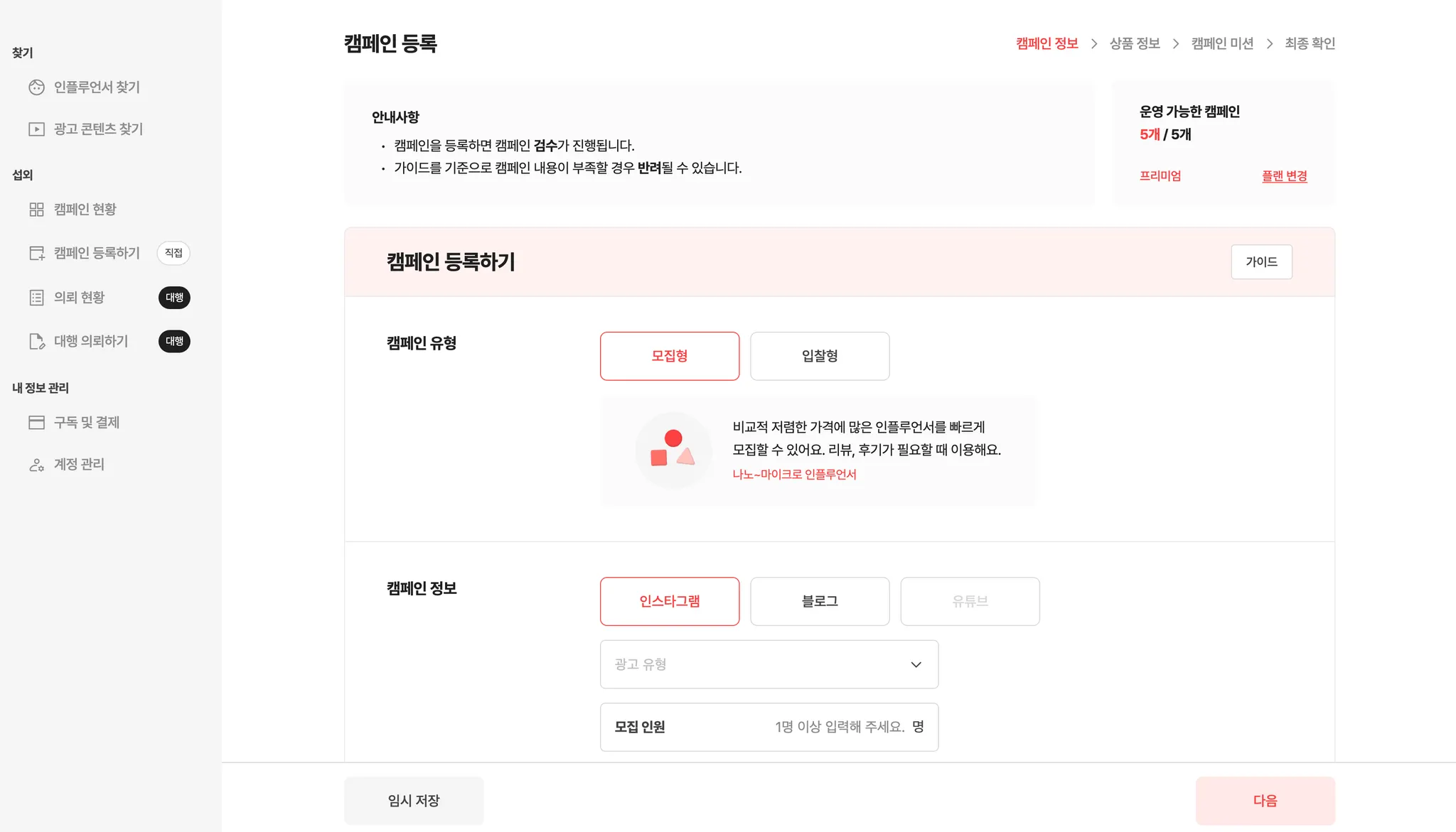 추천형 : 매니저가 캠페인에 어울리는 인플루언서 추천 / 주로 팔로워 1만 이상 / 구매 전환율 높이고 싶을 때