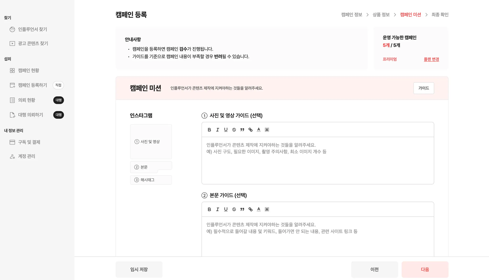 캠페인 미션에 대해 작성이 어려울 때는 우측 상단의 ‘가이드’를 확인해 주세요.