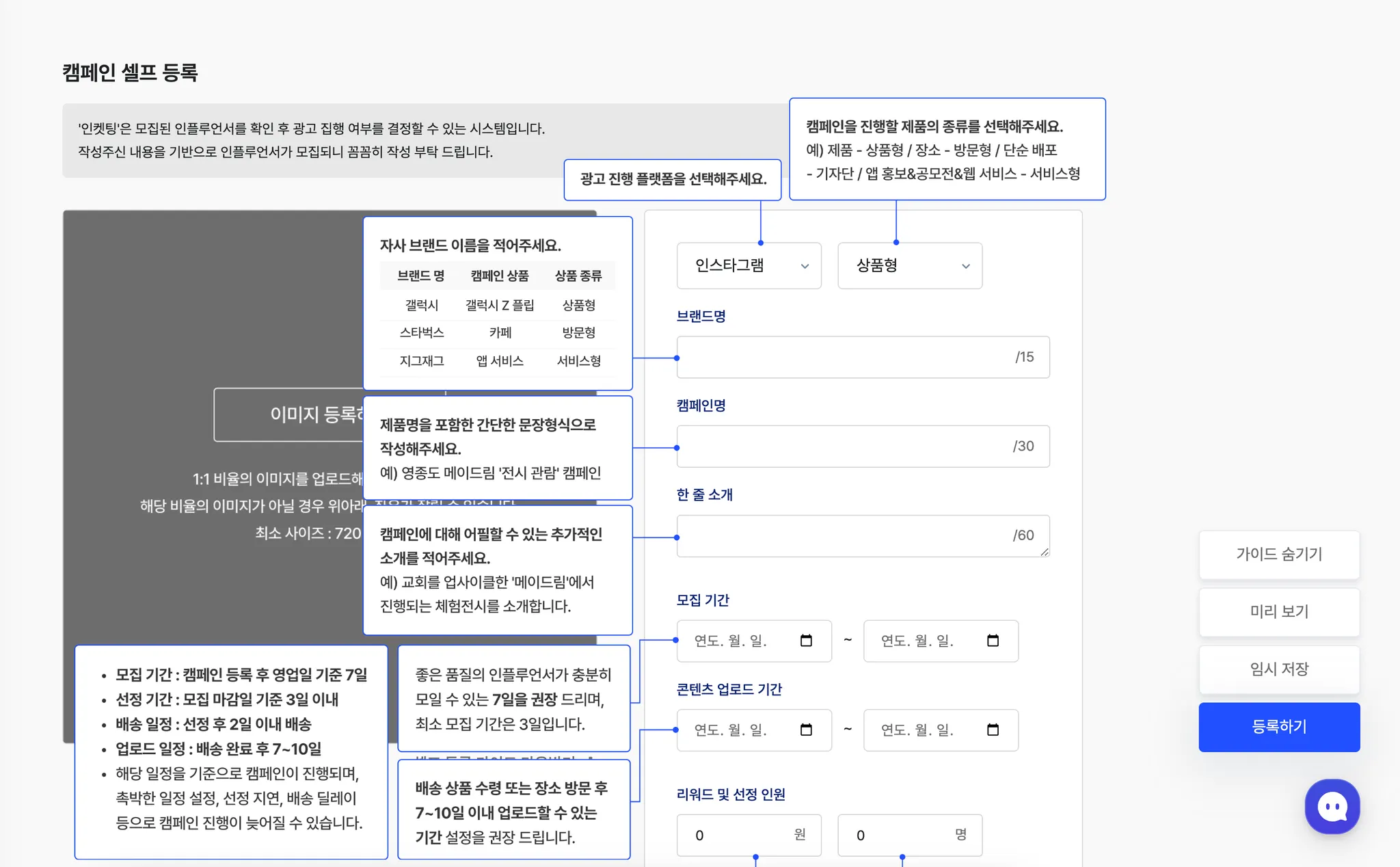 목표 설정과 진행하고 싶은 인플루언서의 기준을 정했다면 콘텐츠 제작 일정을 고려한 캠페인 마감 일정과 인플루언서들이 어떤 내용으로 상품을 홍보해줬으면 좋겠는지에 대한 가이드를 설정해야 합니다.